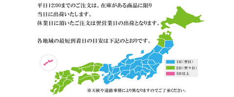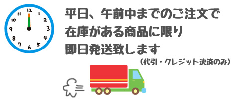 平日午前中までのご注文で、在庫がある商品に限り当日発送致します。(代引・クレジット決済のみ) その他お取り寄せ商品に関しましては、商品お取り寄せ後の発送になります。 その際はメールにてご連絡させて頂きます。土日月の発送業務お休みさせて頂きます。